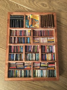 It involved making all these little book, covers courtesy of kind miniaturises who shared them on the internet. It is both a satisfying and bone crushing activity. Because I mostly use magazines to create the insides, I need to cut them to fit. My wrist and previously broken finger make their protests after quite a short time.